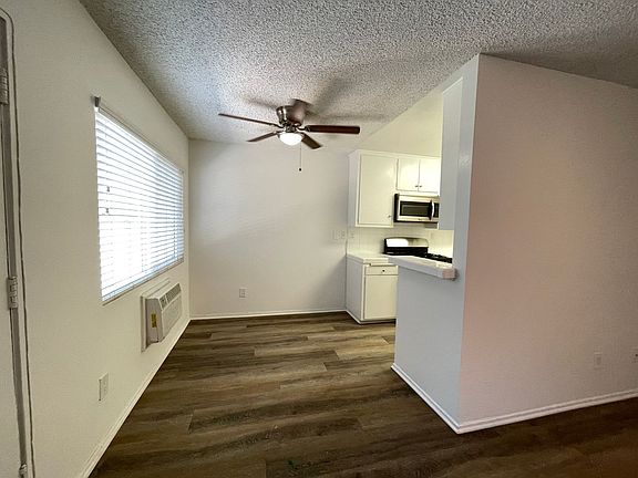 Spacious living and dining area with wood floors and fresh paint throughout. Includes a wall-mounted air conditioning unit, gas wall heater with digital thermostat, ceiling fan with light fixture and dimmer switch, and a new sliding glass door with vertical blinds leading to your private patio.