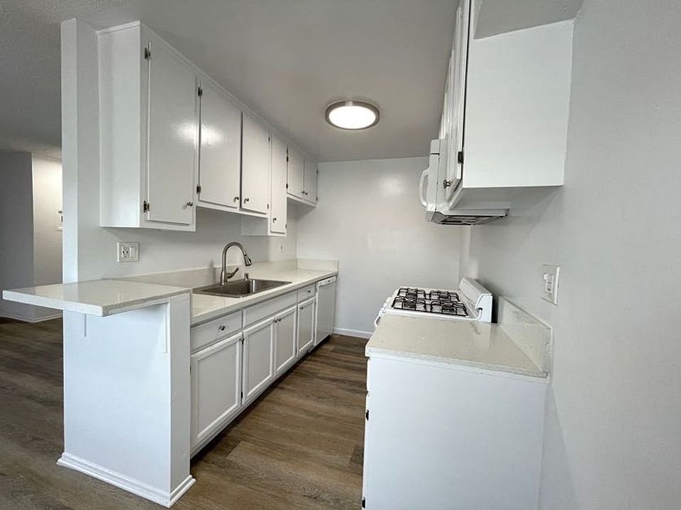 Modern kitchen with wood flooring, white granite countertops, white appliances (gas stove/oven, dishwasher, and over-the-range microwave), a stainless steel sink with tall faucet, ample cabinetry, USB port/outlet, and updated lighting.