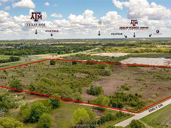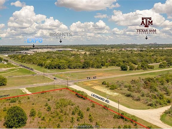 This 18.929 acre tract of land in a Bryan Opportunity Zone at the center of the upcoming Riverside Innovation Corridor project is close to TAMU, TAMU Health Science Center, Easterwood Airport, TAMU Rellis Campus, and the Brazos County Expo Center. It is located on the hard corner of Highway TX-47 (Riverside Parkway) and Leonard Road. There are no pipelines or easements running through the property, no significant elevation changes, and Wellborn Water is available on site. There is a City of Bryan 3-phase transmission line across from Emily Drive at the west boundary line and single-phase electricity on site along Leonard Road. The property provides 810+/- feet of Hwy 47 (Riverside Parkway) frontage, 1300+/- feet of Leonard Road frontage, and 700+/- feet of Emily Drive frontage. The City of Bryan has 2023-2025 planned sewer line upgrades and extensions. Targeted for massive growth in the next 2-5 years, this area is prime for investment.