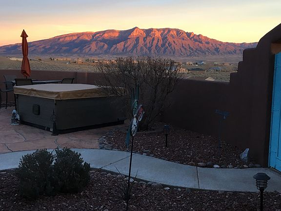 Fabulous custom pueblo style home perched on top of a hill with amazing views of the Sandia Mountains and city lights. Some great bonuses to this 3 bedroom 2 bath home include vigas, nichos, plaster walls, 2 sided fireplace, raised ceilings, tile flooring, hickory cabinets, skylights, courtyard, custom lighting, step down living area and stainless steel appliances. The fantastic backyard offers SW landscaping, covered patio and a hot tub to relax and enjoy the views. Front courtyard, new stucco and recently paved driveway, parking area and RV pad. Recently installed 8K solar power system to run entire house.