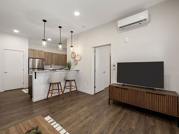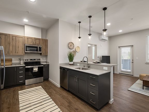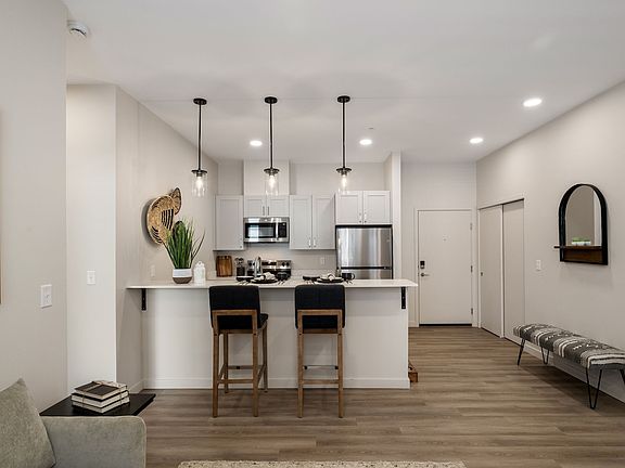 - Exterior features: 24-hour parcel room and cold food storage, 32 EV charging stations with public access, BILT Rewards, Commercial coffee station, Custom slow-closing two-toned cabinetry, Easy freeway access to Highway 395, Food truck pavilion and park with public access, Garden-style tub, Kitchen breakfast bar, On-Site Management, Pet-friendly community with an on-site pet spa, Secured key card building access, View Type: Expansive windows for premium views