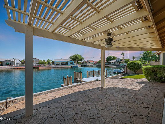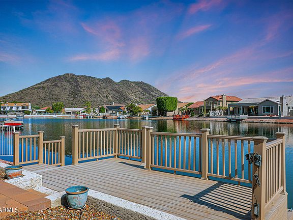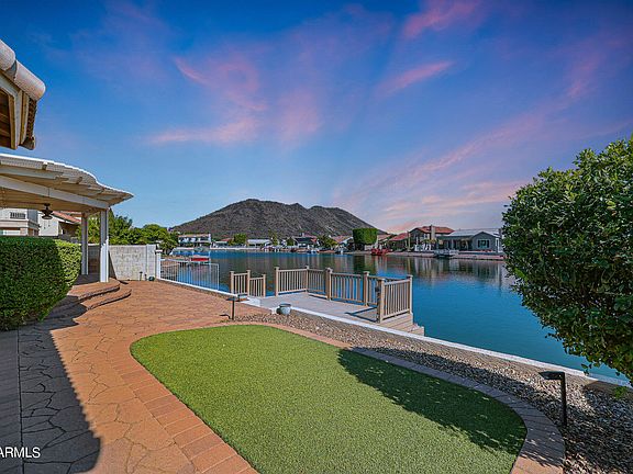 LAKE FRONT PROPERTY in the Highly sought after Arrowhead Lakes!! Enjoy amazing AZ sunsets from your own dock! Backyard boast peace and serenity with stunning mountain and lake views!! Low maintenance yard with Extensive hardscape, artificial turf allows you more time to enjoy those gorgeous sunsets, fishing or stargazing right off your own boat dock. Recently renovated the boat dock is also low maintenance with long lasting poly wood deck. Located on a cul-de-sac street for low traffic, this 3 bedroom 2 bath, features a 3 car garage with built in cabinets and epoxy floor. Step inside to be greeted by that stunning view through the rear windows for the home. Formal living and dinning room allow for additional living space for home office, home school or large holiday gatherings. The heart of the home situated off the back of the house to maximize the lake view is an open concept with family room and breakfast nook, featuring newer stainless steel appliances, granite counters and neutral paint scheme. Spacious Owner's suite, with cathedral ceilings, yet again taking in those picturesque lake views! Owner's baths features TWO walk in closets, double sinks, large garden tub, walk in shower and private toilet room. Both bedrooms 2 & 3 have vaulted ceilings giving them a more spacious feel. All this located minutes to the 101 Fwy for easy commutes and all the shopping and entertainment the Arrowhead area allows.
