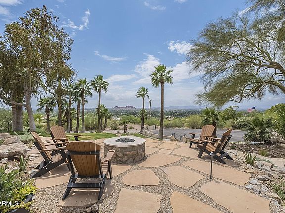 Welcome to this stunning hillside retreat, perfectly situated at the end of a private cul-de-sac with panoramic views from every room. As you approach, you're greeted by a beautifully manicured front yard designed like a private park, featuring a lush lawn and cozy fire pit surrounded by ample seating an ideal spot to take in breathtaking views of the mountains, city lights, and the 13th hole of the Phoenician Golf Course. Step through the grand double doors into a marble-floored foyer bathed in natural light. This fully renovated home boasts new flooring throughout, fresh paint, upgraded brass hardware, and stylish new lighting fixtures in every room. The spacious living room features a dramatic floor-to-ceiling gas fireplace, creating a warm, welcoming ambiance.