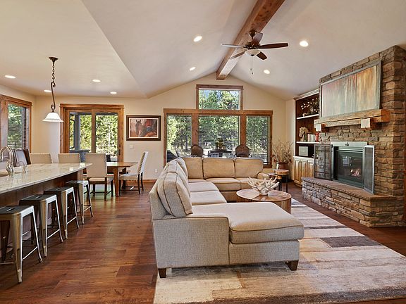 This beautiful four-bedroom cabin coveted Caldera Springs offers 3 en-suite bedrooms each with its own private entry, an open floor plan, vaulted ceilings, stacked stone fireplace, large windows allowing for an abundance of natural light, a spacious mud room, and an attached double car garage. The kitchen features a large island , a walk-in pantry, SS appliances, and a gorgeous copper hood. Upstairs you will find a generous bonus room along with a sleeping area that includes two sets of built-in bunk beds. The outdoor living area offers a covered eating area, fire pit and hot tub.