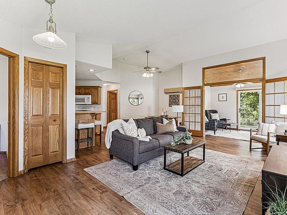 This end unit is surrounded by green space and a pond right outside the 4 season porch and patio. When you walk in you will notice custom woodwork and cabinets, vaulted ceilings and updated flooring. Off the living room you go through the glass French doors to the 4 season porch. There are 2 large bedrooms with plenty of storage. Electric in-floor heat, 2 car garage and a very convenient location. 55+ neighborhood, no pets or rentals allowed.