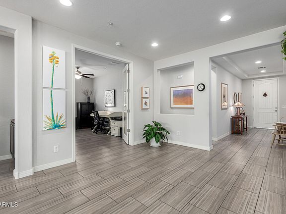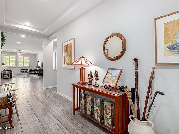 Immaculate Shea Captivate Model nestled in a peaceful cul-de-sac with no direct rear neighbors, just tranquil desert retention views. This beautifully maintained 3-bedroom, 2-bath home with a den showcases an open-concept layout designed for modern living. Features include elegant staggered rectangular tile flooring, an oversized granite island, stone backsplash, built-in wall oven and microwave, and upgraded soft-close cabinetry throughout. The den is enclosed with stylish double glass doors, creating a space for a home office. The large laundry room offers built-in cabinets and a clothes rack for added functionality. A spacious great room flows seamlessly into the low-maintenance backyard, which features a covered patio, synthetic grass, a built-in gas BBQ, and fire pit. Brick driveway