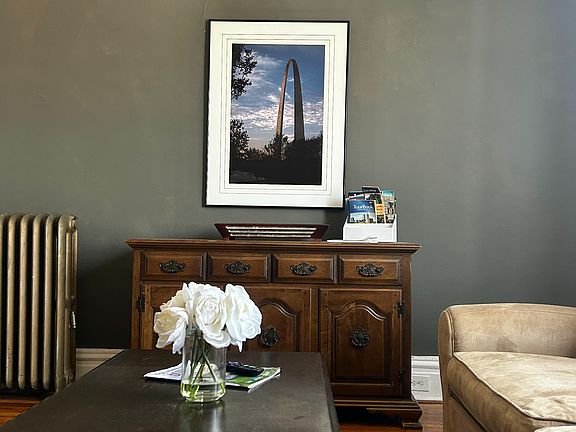 Our 6-unit building is located in the desirable DeBaliviere neighborhood near Forest Park. This third floor 2 bedroom/1 bath suite can sleep up to 5 guests. Enjoy a king bedroom for you plus a second bedroom with a full and queen bed. Only a 2 block walk from the Forest Park Metrolink train stop, this 100 year-old historic home is in a safe, walkable neighborhood, only steps (or easy bike) to Forest Park.