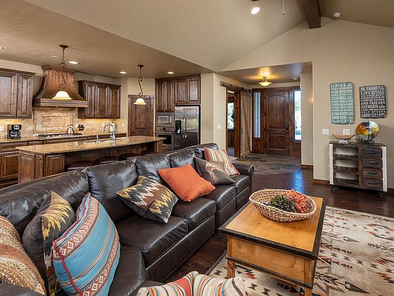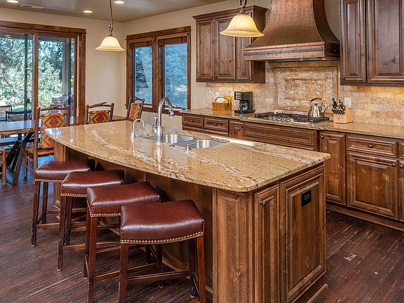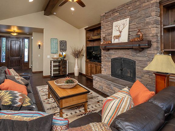 Caldera Cabin with views of Caldera Links executive golf course! High end features throughout, including gourmet kitchen with slab granite counters, knotty alder cabinets and gas cook top with copper hood. Vaulted ceilings in the great room, gas fireplace with raised hearth and built ins. 3 master suites downstairs, plus an office/sitting room. Additional suite upstairs includes two built-in bunk beds and a bonus area. Outdoor living space with covered patio, hot tub and views of the golf course. Private driveway leading to a 2 car garage.