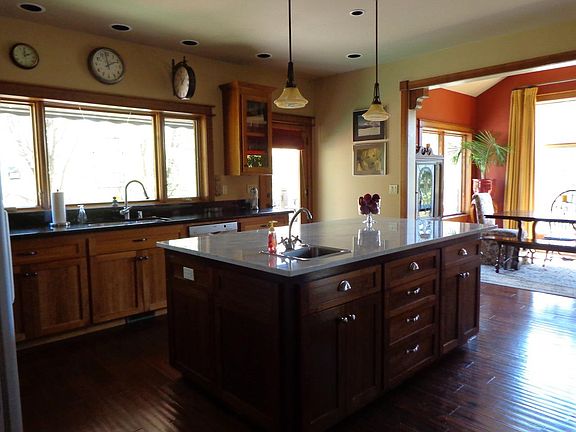 Unique custom home reminiscent of an English manor with wide plank walnut floors, soaring ceiling in living room with "bridged" walkway for upstairs rooms. 2 gas fireplaces, custom leaded glass features, kitchen features cherry cabinets, large island, granite & marble counters, walk-in pantry. Master suite with walk-in closet, master bath with double sinks, spa tub. Beautifully landscaped, large deck with roll out canopy for summer enjoyment. Attention to every detail.