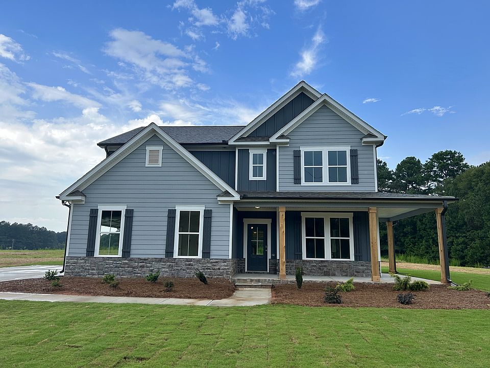 The Farmington plan built by My Home Communities. A new construction two-story home boasting 4 spacious bedrooms and 3 full baths, providing plenty of space for your family and guests. Step inside the foyer and you will notice the elegant judges paneling in the separate dining or office space. An open concept kitchen features beautiful quartz counter tops and is perfect for hosting gatherings with family and friends. The huge kitchen island overlooks the family room, creating a seamless flow between the spaces. A bedroom and full bath is on the main level for your guests convenience. Additional secondary upstairs bedrooms offer plenty of space and closet storage. The laundry is conveniently located on the upper level. The oversized primary suite is complete with a huge walk-in closet, dual vanities, separate tub and tile shower, perfect for relaxing after a long day. Enjoy the luxury of a large estate size when you sit on the wrap around porch or the covered back patio for entertaining or relaxing outdoors. *Secondary photos are file photos.* Matterport tour is an example of the floor plan and not of the actual listing. Quick Move-In