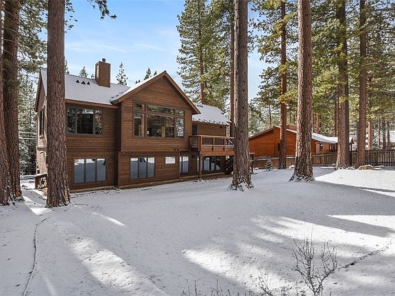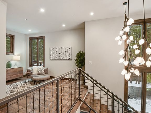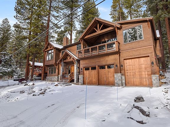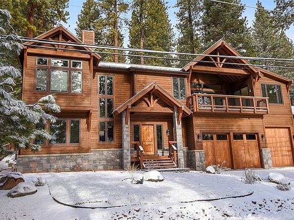 Brand New contemporary Tahoe-style residence w/ modern accents at low elevation. The upper floor boasts an expansive open kitchen, a double-sided fireplace, & a separate dining area w/ a temperature-controlled wine wall. The main bedroom includes a 2nd LED fireplace, a spacious bath w/ a separate tub & shower, & laundry conveniently located in the closet. Enjoy outdoor spaces with a covered front deck & a large back deck. The living area features DuChateau hardwood flooring, in-floor radiant hydronic heat, and open beamed vaulted ceilings. High-end appliances and quartzite slab counters adorn the impressive kitchen. An additional lounge area, another bedroom, and a full bath complete the upper floor. With convenient elevator access, accessibility is seamless. The lower level offers a spacious family room w/ a fireplace & dry bar, a second guest suite, two bedrooms with ensuite baths, an office + full bath. Finished 3-car garage features epoxy flooring & electric vehicle charging.