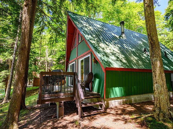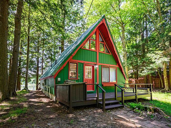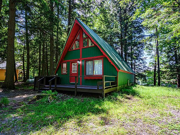 This waterfront property offers serene natural beauty and a location convenient to the village of Old Forge. Nestled on the tranquil shores of Twin Pond, this classic A-frame home has been tastefully renovated to provide modern comfort while maintaining its timeless charm. As you step inside, you'll find a newly updated kitchen with new appliances and finishes, making meal preparation enjoyable.  The living room, with its cozy woodstove, provides a perfect spot for gathering with family and friends. Large windows overlooking the water flood the space with natural light and offer lovely views, and the living room opens directly onto the deck, where you can enjoy the soothing sounds of nature. The first-floor primary bedroom is complete with a private half bathroom.  There is also a renovated full bathroom on the main floor. Upstairs, the second floor offers additional living space with a second bedroom and an open loft area, which could serve as an office, reading nook, or extra sleeping quarters. This home has a detached garage for your toys, .56 acres, 100 feet of waterfront, and a fire pit area with a nice view. It is a terrific location for snowmobiling and is offered turnkey/furnished. Whether you are looking for a peaceful getaway or a year-round home, this property delivers an idyllic setting with easy access to the amenities and activities of Old Forge. Embrace the best of both worlds with this charming waterfront retreat.