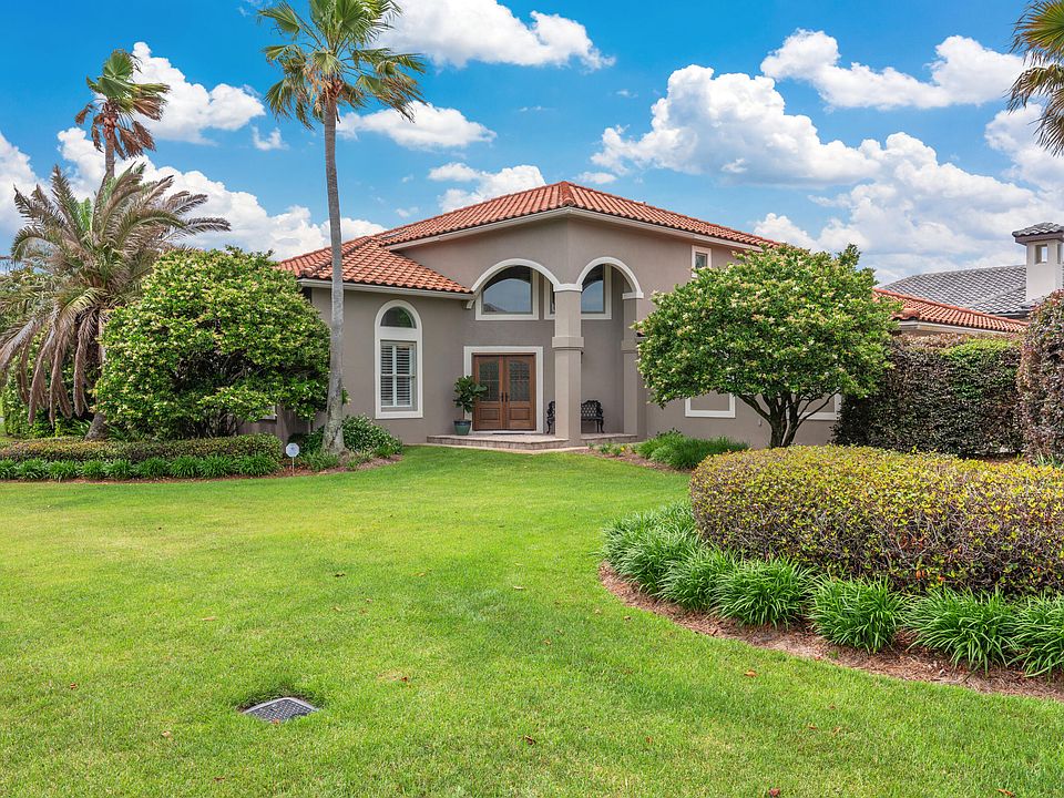 Situated on a beautifully landscaped 0.35 acre corner lot in the exclusive, gated community of Bellamar at Gulf Place, this Mediterranean-style residence offers 4 bedrooms, 3.5 baths, and 3,347 square feet of refined coastal living. Just steps away from a private neighborhood path leading to Gulf Place and a deeded beach access, this home combines privacy, space, and a premier 30A location all at the most attractive price in the community. With solid construction and generous square footage, it offers the chance to personalize and enhance the home to match your vision and lifestyle. The main level features one of two spacious primary suites, complete with a fireplace and en suite bath. Newly upgraded flooring flows throughout the first floor, where two expansive living areas with 17-foot ceilings and an abundance of natural light create a sense of openness and elegance. One living area, featuring its own fireplace, seamlessly connects to the kitchen, complete with an island and serene backyard views. Adjacent to the kitchen is an office space, perfect for a home workspace or a quiet place to unwind. The other living area opens to a formal dining room, providing an ideal setting for entertaining.