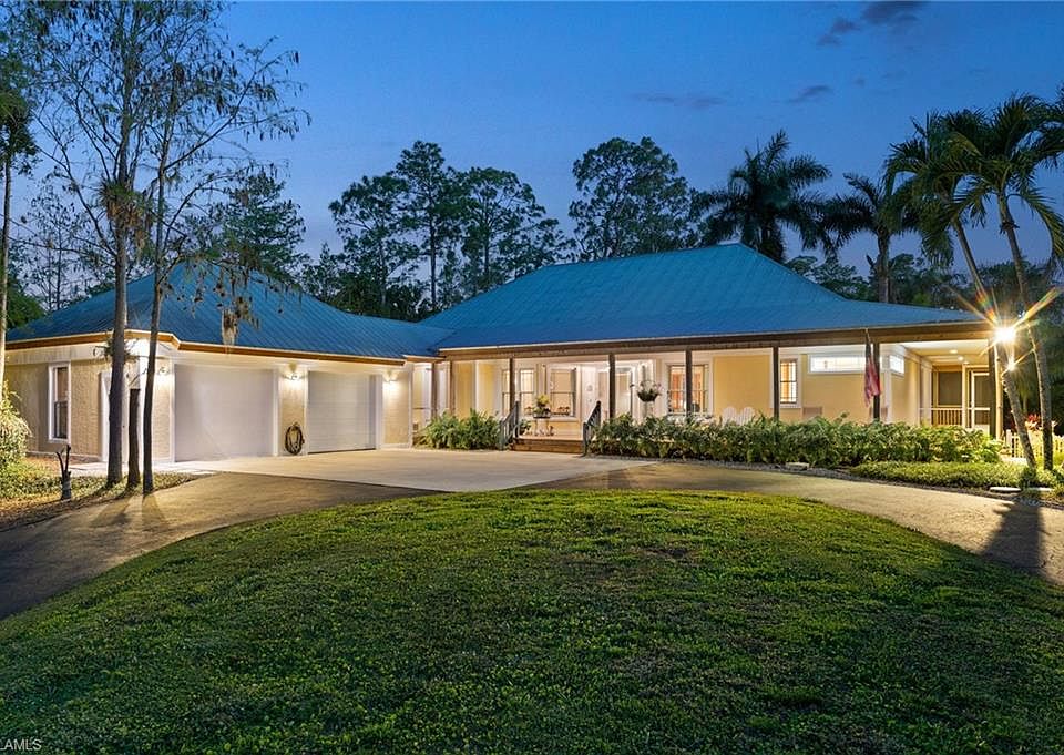 Discover a masterfully crafted Florida Vernacular estate in the heart of Oakes Estates, Naples, FL, where expert craftsmanship meets timeless design. This stunning property offers a main house, guest house, and expansive outdoor spaces, all designed with quality and longevity in mind. The main home features 3 bedrooms plus a den. Soaring 10-ft ceilings and 8-ft doors throughout create an open and airy feel, while prairie-style windows enhance its architectural charm. The interior showcases custom, locally crafted solid rock maple cabinetry and unstained white oak flooring, adding warmth and character to the home. The primary suite boasts a one-piece marble shower and a custom walk-in closet. Functionality meets convenience with a whole-house reverse osmosis system, a new exterior and interior paint job, and masonry construction. The home is designed with no interior load-bearing walls, allowing for a flexible floor plan for potential future updates. Extra-deep garages provide ample storage, and the property includes an air-conditioned shed. Additional features include a central vacuum system with a new motor, copper plumbing, a newer water heater, and a 5-ton AC. The guest house, built in 2006, offers 1,100 sq. ft. under air with 2 bedrooms and 1.5 baths. It features polished concrete floors, impact-resistant PGT windows, and high-end finishes, including granite countertops and luxury German cabinetry. Stainless steel appliances complete the modern kitchen, making it a perfect retreat for guests or extended family. Outdoor living is a dream with a 3/4 wraparound porch that exudes Florida Vernacular charm. The property includes a gunite pool with a new filter recently installed. A tranquil canal in the backyard provides a perfect spot for fishing, with large-mouth bass, peacock bass, snook, and gar frequently found in the waters. Situated in Zone X, flood insurance is not required. The home sits 50 inches above the crown of the road, ensuring an elevated and secure foundation. This estate seamlessly blends luxury, durability, and thoughtful design, creating a home that is as functional as it is beautiful. Enjoy the serene, private setting of Oakes Estates while being just minutes from Naples' world-class dining, shopping, and beaches. Schedule a private showing today and experience this one-of-a-kind property for yourself!
