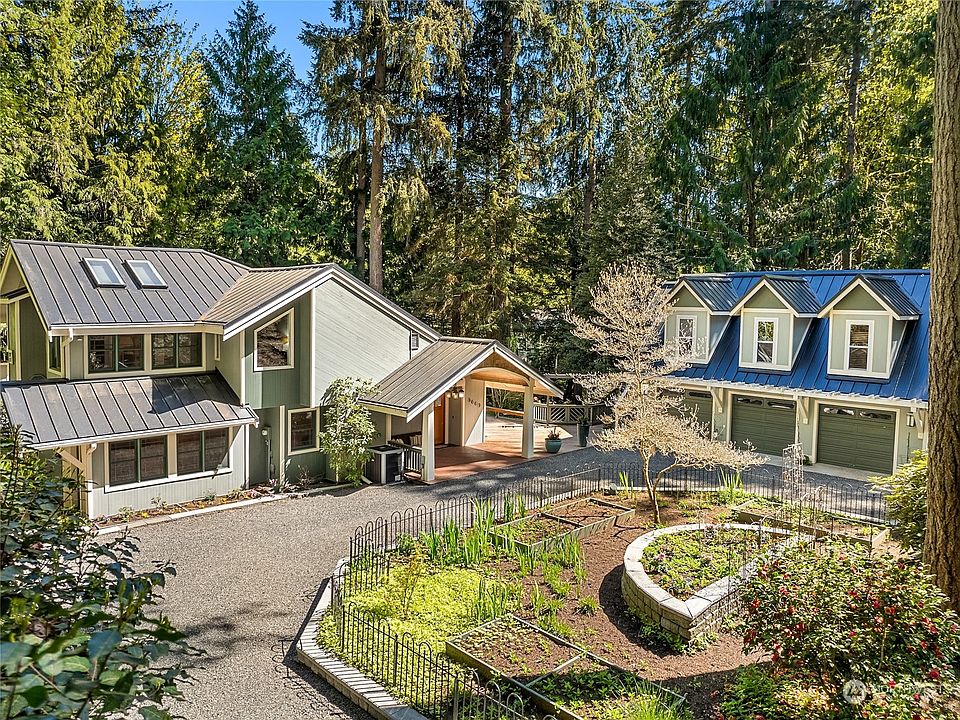 Find your private oasis at this artful home on a generous, level acre in the heart of Bainbridge Island. Nestled down a country lane, this 3-bedroom home has been lovingly updated through the years. Impressive craftsmanship surrounds you with a stylish blend of hardwoods, lustrous granite and exceptional cabinetry. Designed for function and flow, the kitchen is center stage with entertaining spaces that flow to dining and a spacious deck beyond. The primary suite enjoys a personal library complete with bookcases and a cozy fireplace. A spacious walk-in closet and beautiful bath with heated floors complete the primary. The oversized 3-car garage includes office/flex space above with a ¾ bath and gleaming hardwood floors.