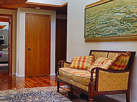 Following a "down to the studs" 2019-2020 renovation, the entire property was further improved through a complete landscaping redesign over two years as well as refinements and improvements during 2022 through 2023. Today, the home exudes a sort of grounded, dynamic energy of a welcoming, peaceful space with an indescribable *something* made possible through love, attention and time. You will find a musical blend of bold design choices and quality materials. This includes Brazillian acacia hardwood floors upstairs and downstairs which complement the distinctive apricot-hued raw, natural wood ceilings that soar to twenty-five feet in select areas. The renovation's centerpiece - a re-imagined master suite - features a private passage to a Zen garden, epitomizing the home's indoor-outdoor philosophy.