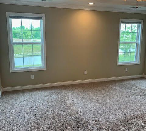 The kitchen features beautiful custom-made Amish cabinets, granite countertops, and stainless steel appliances. You can enjoy meals in the eat-in area while taking in serene views of the water, or dine outside under the covered patio. The home is adorned throughout with elegant crown molding. The primary bathroom includes double sinks, a tiled shower, and separate walk-in closets for both husband and wife.