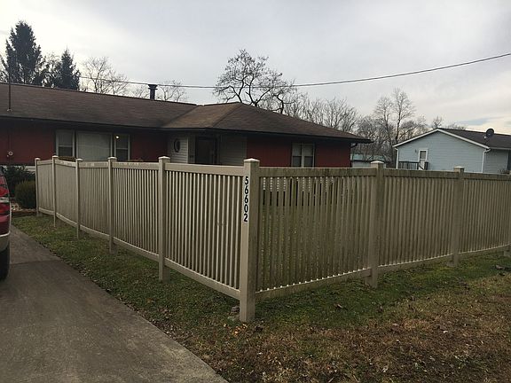 Exterior of home is vinyl siding, T 1-11, vinyl windows, and shingled roof less than 10 years or so. Vinyl fence in the front yard for privacy.
