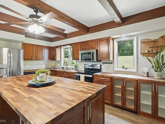 Inside, the home features a bright and spacious main living area with exposed wood ceiling beams and abundant natural light. The kitchen has been updated to include warm butcher-block countertops, a custom lazy susan, and stainless steel appliances including a new stove (2022) and refrigerator (2019).