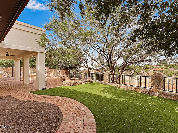 Beautiful custom Mesa Hills home with serene mountain views front & back and located on a quiet cul-de-sac. Conveniently located to shopping, restaurants, Solano mall, I-10 to UTEP & Medical Center. Open concept with high ceilings. Live-in room with fireplace, dining area, gourmet kitchen with custom built cabinets. Stainless appliance package plus refrigerator. Built in niche with desk area. 3 Bedrooms downstairs and the Primary bedroom is downstairs and bathroom has soaking tub, and huge walk-in closets. Upstairs has 2 more guest rooms plus office/study or 6th bedroom with access to balcony with mountain views. Gorgeous backyard is perfect for entertaining! (Amenities: Hardwood floors, quartz countertops, brick patios front & back, Pella windows & doors, Lutron shades, shutters, insulated studio in garage with epoxy flooring makes a perfect workshop or creative space. New AC/HVAC, new water heaters plus water softener.) A sophisticated blend of style & function.