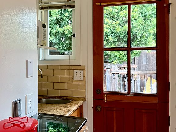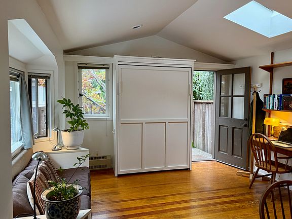 Beautiful and thoughtfully designed cottage in homeowner's back yard. Has good natural lighting (windows on three sides and a skylight.) Southern yellow pine floors and oak cabinetry. Kitchen is small and has a 2 burner induction cooktop, an undercounter refrigerator/freezer, and a microwave oven. Trader Joe's is less than a block away. The apartment comes furnished with a loveseat, wall bed (double) built in casework and shelves. Has tub in bathroom and fully tiled bath.