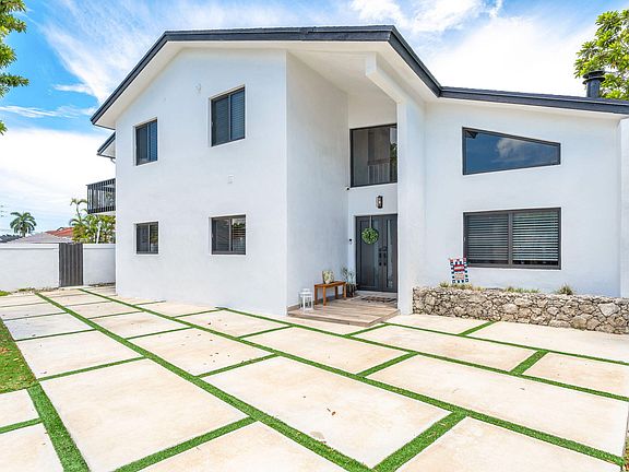 Contemporary style with modern remodel finishes define this 3BR/2.5BA two-story pool home with 1-car garage. Adding a fenced yard, and 240V Tesla charging on an oversized lot with expansive driveway and great curb appeal. Dramatic double doors open to a bold black-and-white tiled foyer with soaring ceilings and a stunning real wood staircase. The living room showcases vaulted ceilings, oversized windows, and a wood-burning fireplace with chimney. The updated kitchen has white cabinetry, peninsula seating, and vinyl flooring throughout home. Step outside to a massive backyard remodel with turf floors, a screened patio for quiet time, then outdoor kitchen bar overlooking the sparkling pool and tropical landscaping. This is the perfect home for football season ultimate entertaining.