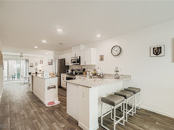 Modern ceiling fanBreakfast barVinyl flooringUpgraded carpetGranite counters