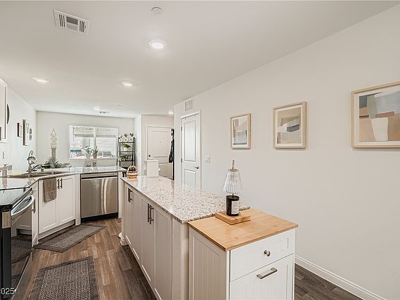 BETTER THAN NEW TOWNHOME! NEAR HIGHLY SOUGHT AFTER SUMMERLIN! SUPER CLEAN! 100% MOVE IN READY! SOLAR IS OWNED AND WILL CONVEY WITH THE SALE. ISLAND KITCHEN WITH RAISED PANEL WHITE CABINETS, GRANITE COUNTERS, BREAKFAST BAR, STAINLESS STEEL RANGE OVEN, STAINLESS DISHWASHER, STAINLESS MICROWAVE AND STAINLESS REFRIGERATOR, WASHER AND DRYER, ALL INCLUDED AND LIKE NEW. DINING AREA WITH RESESSED LIGHTING AND VINYL FLOORING. LARGE FAMILY ROOM WITH MODERN CEILING FAN, VINYL FLOORING. PRIMARY BEDROOM WITH UPGRADED CARPET, MODERN CEILING, FAN, WITH REMOTE AND CLOSET. SECOND BED WITH MODERN CEILING FAN WITH REMOTE. REAR YARD, PERFECT FOR ENTERTAINING OR A PET. SUBDIVISION BOASTS A PARK, TWO DOG PARKS. EV CHARGING STATIONS. A POOL, AND A BBQ AREA WITH CABANAS. SUPER CONVIENENT LOCATION, RIGHT OFF THE 215 EXPRESSWAY. HOA COVERS INTERNET, CABLE, WATER, TRASH AND MANAGEMENT.