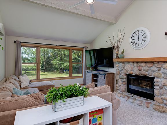 Welcome to your ideal Northern Michigan retreat! This beautiful 3-bedroom, 2-bath ranch-style home offers 1,621 sq. ft. of well-designed living space on an expansive 2.5-acre lot. The large primary bedroom includes a luxurious walk-in closet and an entirely remodeled en-suite bathroom. Indulge in a spa-like experience with multiple showerheads, subway tile, a built-in shelf, and a double-sink vanity on a stylish tiled floor. The guest bathroom has also been tastefully updated to match the home's elegant design. The spacious living room, featuring cathedral ceilings and a cozy fireplace, is perfect for both relaxation and entertaining. Adjacent to the living area, you'll find a formal dining room, a welcoming foyer, and a practical mudroom for added convenience. The kitchen is a chef's delight with newer appliances, ample counter space, and a pantry for all your storage needs. Step outside to enjoy the vast, beautifully maintained yard—an outdoor enthusiast's dream. The covered patio with a durable Trex deck provides a perfect spot for outdoor dining, relaxation, and enjoying the surrounding natural beauty. Two sheds offer additional storage space for all your tools and equipment, while the asphalt driveway leads to a spacious 2-car garage. Energy efficiency is a highlight of this home, featuring a geothermal heating and cooling system paired with a programmable thermostat, ensuring year-round comfort while minimizing energy costs. Located just minutes from all that Traverse City has to offer, this home is the perfect blend of peaceful country living and easy access to urban amenities.