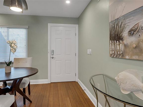 This beautifully remodeled, southern-facing 2-bedroom, 2-bath condo is move-in ready and designed for easy Florida living. Located in a private, tucked-away spot, the condo is surrounded by beautiful landscaping, including silver Bismarck palm trees that add both elegance and enhanced privacy. Enjoy your morning coffee on the lanai overlooking the sparkling brand-new community pool—just steps away via a private sidewalk. Out your front door, you'll find well-maintained tennis courts for added recreation. Inside, the open-concept kitchen features granite countertops, stainless steel appliances, and convenient pull-out drawers in the cabinetry. Warm wood floors run throughout, complemented by remote-controlled ceiling fans in every room and sleek new designer interior doors. Both bathrooms are tastefully updated, and the entire home is equipped with high-impact windows installed in March 2024. The upgraded 4" baseboards add an extra touch of elegance throughout the space. Surrounded by peaceful, manicured landscaping and nestled in a wooded community, this condo offers both tranquility and unbeatable convenience—with amenities very close to the unit, just minutes from Naples’ world-renowned beaches, shopping, and dining.