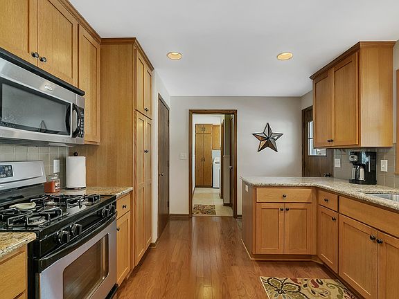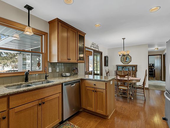 Corner lot boasts an impeccably maintained rambler with a great mix of updates and original charm. The lot is mature with a canopy of trees and a great backyard deck. The main floor hosts a formal living room with a large window scape. Enter the kitchen and dining that has been beautifully updated with quarter-sawn oak cabinetry with shaker fronts. Granite tops and the detailed built-in cabinet features such as pull-outs will have you loving this kitchen. The kitchen and dining merge with a 4 season sun room with vaulted ceilings and access to the deck and hot tub. 3 main floor bedrooms, all with original oak floors. From the garage entrance, you will have immediate access to laundry and a 3/4 bath. The lower level hosts a sizable living space and a 4th bedroom. The storage side of the lower level is awesome. New roof in 2022. New furnace in 2020. Convenient west side location, with nearby parks, schools, sports facilities, and stores. Love where you live- spend your summer here!