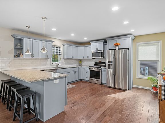 Absolutely gorgeous 3BD/3.1BTH home that has been COMPLETELY rebuilt in 2017 with incredible craftsmanship! The house has been thoughtfully updated and tediously maintained offering SO much value! Fully fenced, private yard with large deck (2020) provides area to watch the sunrise & enjoy the outdoors, surrounded by mature trees & gardens! As you approach this house, you are welcomed by the charming front porch! Bright, open floor plan, neutrally painted and hardwood floors throughout. 2 spacious living spaces: a formal living room & oversized family room featuring vaulted ceiling & wood burning stove. You will love to cook in the upgraded kitchen w/ peninsula/breakfast bar, granite counters, soft close cabinets, SS appliances & eat-in area. The kitchen flows right into the dining area, perfect for entertaining and with sliding doors to the backyard. Powder room on the main level. Unwind in the primary bedroom with a WIC & full en-suite bathroom. 2nd level also features 2 additional bedrooms & full bathroom. The basement is partially finished with huge rec room, full bathroom and laundry/mechanical room with great storage. 2.5 car attached, heated garage and shed. Newer HVAC/AC w/ Humidifier (2021), Hot water heater (2023), & house also has 2 sump pumps and a Kinetico water softener. Easy access to IL23 & IL176. Minutes from historic downtown Marengo!