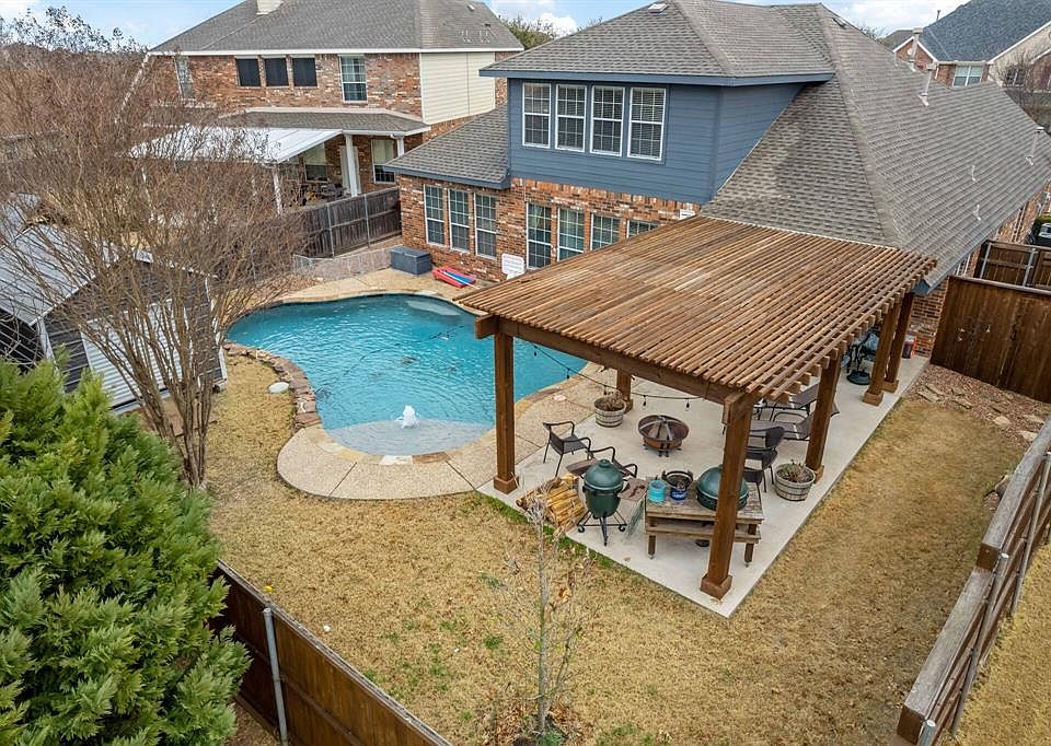 BACKYARD OASIS with pool and outdoor living in highly desired Woodcreek community. Close to I-30, schools, park. Minutes from downtown Fate, Royse City, Rockwall dining, shopping, and medical. Sought after David Weekley floor plan with private study, engineered hardwoods, high ceilings, lots of natural light, upgraded lighting, exterior paint 2021. Stylishly updated master bathroom. All bedrooms down with game room and half bath upstairs. Gorgeous pool with sun deck, fountain, and sprays. Outdoor living has huge pergola with fans providing year round pleasure. 10 x 12 storage building fits two 4-wheelers and lawn equipment plus shelving. Ring doorbell and camera. Community pools, fitness, trails, and clubhouse.