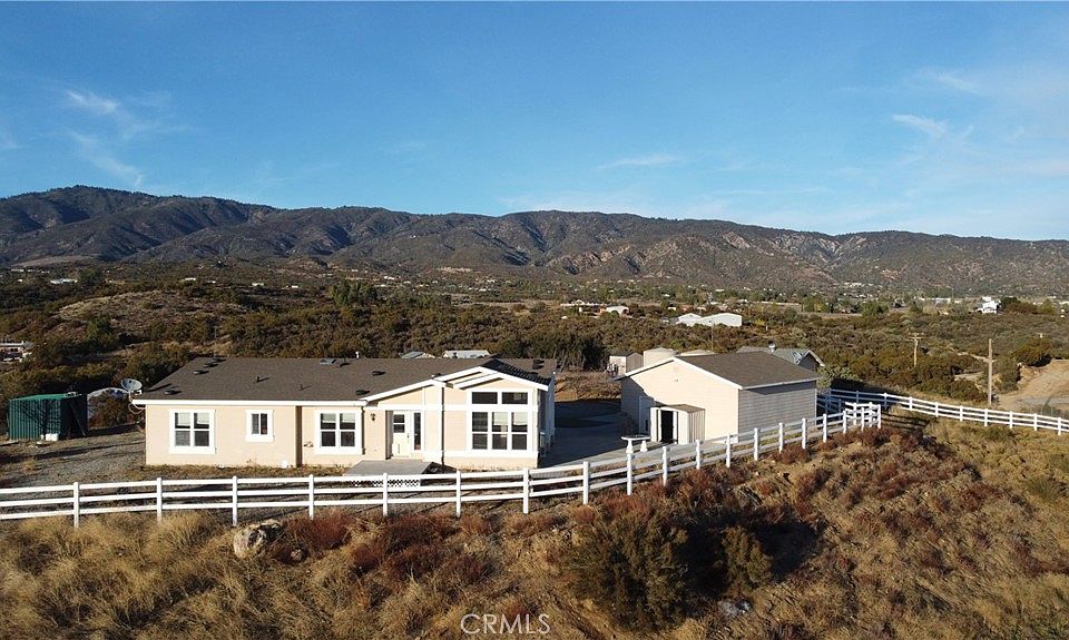 Spectacular hilltop setting overlooking the Anza Valley. Breathtaking unobstructed panoramic views as far as the eye can see! This property is situated on 5 acres of land. Fenced and cross fenced and featuring a gated entry and paved driveway. Improvements include a 3 stall horse shelter plus an additional 2 stall horse shelter with turn-outs, a separate washing rack and hay storage. Multiple out-buildings on the property including a small storage container and Tuff Shed. There is a private well with approx. 10,000 gallons of water storage. The home boasts over 2,200 square feet of living space. Open and bright floor plan with lots of windows and natural light. Spacious kitchen with large center island. 3 car detached garage plus a 2 story workshop. There is a substantial greenhouse for the farming enthusiast. Excellent location. Walking distance to town yet very private! This home needs TLC! So much potential! Bring your vision and your touches and make this your forever home.