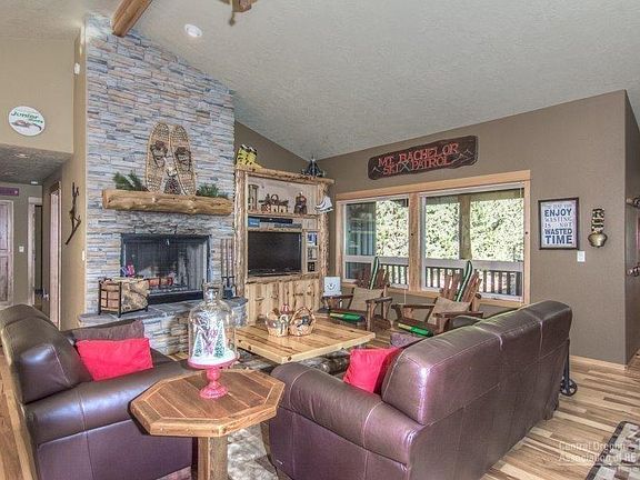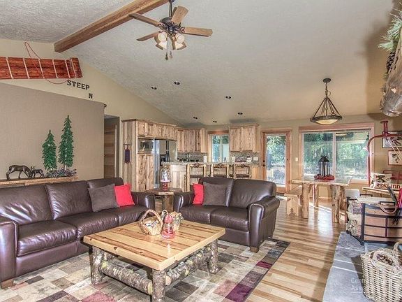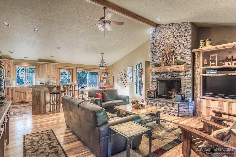 Custom Cascadian lodge-style home in exquisite location! Private & peaceful yet so close in! Convenient access to Mt Bachelor, National Forest, Deschutes River & Sunriver. Desirable great room floor plan on 1.15 (+/-) acre, w/vaulted ceilings, large wood wrapped windows, hardwood flooring, hickory cabinets, granite, stainless, stacked-stone fireplace, recirculating hot water & a triple car garage. All on a quiet loop. Seller to provide complete set of plans for a guest house/shop with purchase.