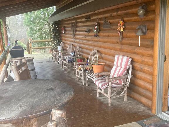 Beautiful three bedroom log cabin in private setting. Open floor plan. Wood burning fireplace in living room. Finished basement. Wraparound covered porch, two stall detached garage, barn/workshop, shed, chickencoop, tree stand hunting blind, and horse riding ring. 19 acres with tillable pasture. GREAT BUY! MUST SEE!