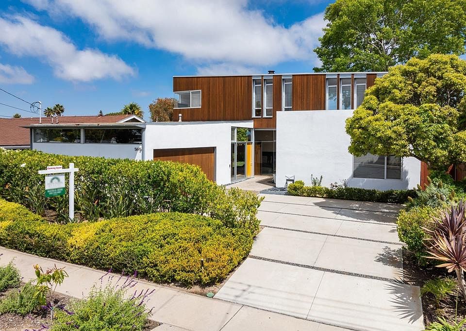 Wedge house designed, built and curated by acclaimed architect Rinehart Herbst available for sale in quiet neighborhood in University City. Come and view this mid century modern masterpiece where no design detail has been overlooked. Light pours into the main living area afforded by floor to ceiling windows and a massive sliding glass door which leads out onto your flat beautifully landscaped private back yard with mountain views off in the distance. Rinehart Herbst was invited back into the home in 2023 to reimagine the kitchen space and install a custom bar area that will leave you in awe. New owner to enjoy a dual element large kitchen island with 5 bar stools for entertaining. Each high end appliance has been cleverly hidden into the design aesthetic complete with Thermador refrigerator, convection oven, steam oven, induction range, dishwasher and microwave tucked into the space. Pull back a sliding door to reveal the custom copper top bar area boasting its own faucet dispensing hot, cold or sparkling water. Bar area with designer lighting elements contains its own a mini dishwasher and cup rinsing station so no effort is wasted in crafting the perfect beverage. The Main living space enjoys open a concept feel with high ceilings, recessed lighting and a floating staircase that brings you to another flex area currently used as a media projection and lounge area. Continue up the stairs to enjoy a private balcony with west facing views for taking in the Southern California sun. Two of the bedrooms are located on the first floor of the property with the additional bedrooms located on the top floor of the home. Come and tour this idyllic piece of real estate before it's too late.