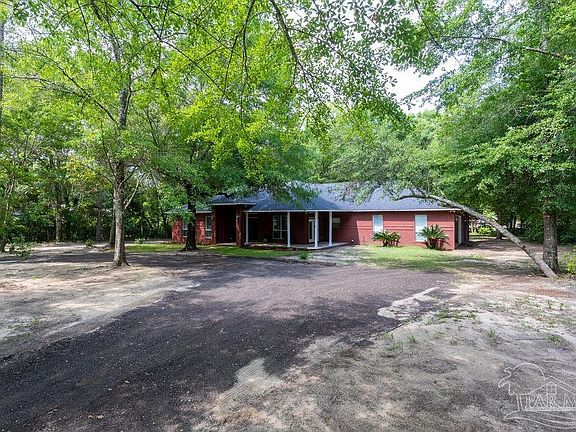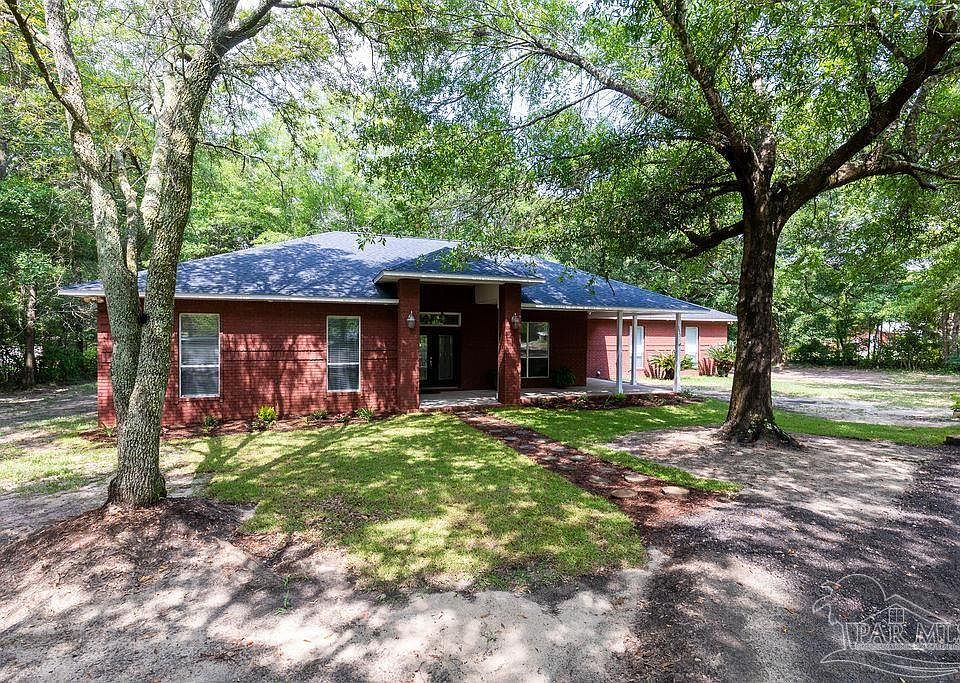 MOVE-IN READY! NEW ROOF 2023! Excellently maintained home situated on 1 acre of land, located in coveted Pace, Florida. Milligan Ford Rd intersects Tunnel Rd about 2 miles from the Five Points shopping area. Single-Family homes built along Tunnel Road report values over 1 million dollars. The sense of arrival is spectacular with a circular driveway isolated by mature landscaping and mature trees creating privacy from the road. Popular Open/Split, floorplan consist of 2563 SF of freshly painted living area with 10-foot ceiling throughout also including 4 bedrooms and 3 full baths. The 18x21 Great Room boasts high [Cathedral] ceilings, Cortec Luxury flooring, display ledge shelfs. There are decorative columns creating a subtle separation from the entry foyer, Great Room, and Formal Dining Room. Relaxing Great Room has a corner gas fireplace with insert for that prized work-of-art. Great Room is adjacent to the 12x27 kitchen/breakfast area creating a seamless living space for family gatherings and entertainment. There are double doors leading from the Great Room to a 560 SF screened lanai adding to this expansive entertainment area. The kitchen has an abundance of wood cabinetry, island with prep sink, stainless steel appliances, built-in microwave, stainless double-compartment sink, and ample counter space. The 12x16 dining room has sufficient space to accommodate furnishings for a large family and friends to enjoy a fine dining experience. The secluded entry to the 15x21 primary bedroom reveals a king-size space with trey ceiling, large windows overlooking the wooded backyard and access to the lanai with electrical connection for a hot tub. The large ensuite bath with separate vanities, shower enclosure, garden tub and private water closet. There are three “split” guest bedrooms that are comfortable and capacious with adjacent full bath. Laundry room is well located linking the oversized, 2-car garage and back hallway with 3rd bath and easy entry into the kitchen.