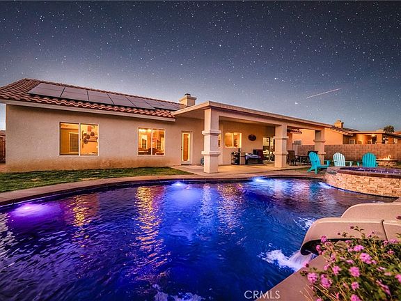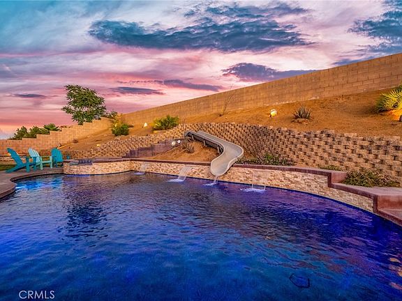 Discover this spectacular four-bedroom, two-bath home, a true oasis featuring a custom inground pool and spa complete with a fun slide. As you approach, the property stands out with its lush trees and vibrant desert landscaping, a rare gem in the area. Step inside to be greeted by soaring high ceilings and expansive open spaces that create an inviting atmosphere.
