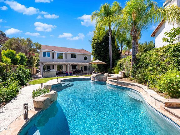 Welcome to 5676 Walnut Ridge Dr in the heart of Agoura Hills - a rare opportunity to own a luxurious and spacious entertainer's home with nearly 2,900 sq. ft. of living space, 5 bedrooms and 4 bathrooms, designed for comfort, style, and resort style living! Fabulous interior location in highly desirable Chateau Springs surrounded by gorgeous mountain views. Striking entryway with soaring cathedral-ceiling foyer that opens to a bright, airy, and spacious open floor plan. The main residence features a stunning remodeled kitchen complete with newer appliances, quartz countertops, cooking range with stone accent, breakfast bar and bay window that overlooks the sparkling pool and spa. Formal dining, family and living room, wine fridge, downstairs bedroom, full bath and laundry. Upstairs, the double-door entry primary suite offers the ultimate in luxury and comfort, with a sitting/entertaining area with custom bookshelves, en-suite bath, spacious closet. and pool and mountain views! Two additional upstairs bedrooms and hall bath provide flexible space for family or office needs. The fifth bedroom is a charming, detached in-law suite casita, complete with its own full bedroom and bath - perfect for guests, extended family, or possible rental income. A rare find indeed! The backyard is a resort-like tropical oasis, with a sparkling pool, spa, lush queen palms, patio and bbq for entertaining, landscaped privacy wall, and vibrant greenery. The charming courtyard and side yard at entry features mature mandarin and lemon trees, brick and stone accents, and a breezeway that creates a cozy, secluded vibe. Picture windows throughout the home invite the outdoors in, framing peek-a-boo mountain views. Newer roof, plenty of parking. Close to beaches, excellent schools, shopping, parks, entertainment and hiking trails. This highly unique property is rarely on the market ! Don't miss this chance to call Walnut Ridge your home!