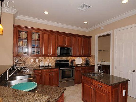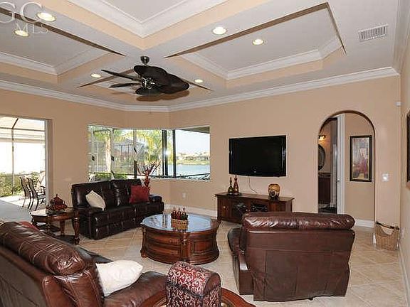 More upgrades than we can list in a home that looks like it has never been lived in! 4 bedrooms, 3 baths and 2 car garage. Large family room with coffered ceiling, crown molding throughout the home, plantation shutters on all windows, tray ceiling in dining room and master bedroom; 8 decorative ceiling fans including one on the screened extended lanai. Sliders in family room to lanai pocket into wall for open feeling. Beautiful lake view overlooking lighted fountain. Master suite has 2 closets, dual sinks with granite countertops, tub, and tiled shower with glass block enclosure. Kitchen has tile backsplash, center island with vegetable sink; stainless appliances, desk, and granite counter tops. Separate laundry room with washer, dryer and laundry tub. Built in security system and in-wall pest control Emerson Square is a gated community with clubhouse and community pool, just minutes away from Gulf Coast Town Center and Coconut Point Mall, close to airport, beaches and entertainment.