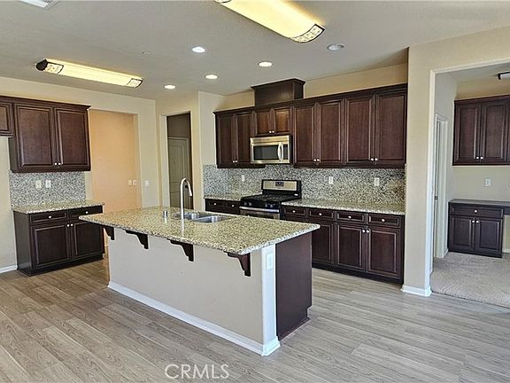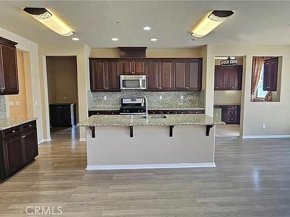 The home welcomes you with an open and airy floor plan featuring large windows, elegant lighting, and warm natural tones throughout. The kitchen is a centerpiece, offering granite countertops, rich cabinetry, stainless steel appliances, and a large island that overlooks the dining and living areas. Sliding glass doors lead directly to the backyard, allowing sunlight to fill the space and creating a seamless flow for indoor and outdoor living.