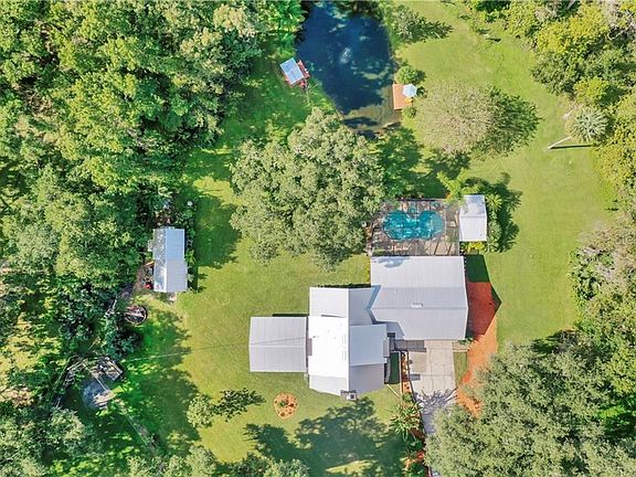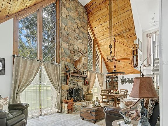 One or more photo(s) has been virtually staged. THIS IS IT! Looking for a UNIQUE CUSTOM SCREENED POOL HOME on 2+ ACRES in a beautiful neighborhood with NO HOA, this is Fla. living at it's finest! With NO HOA, This beautiful home with PECKY CYPRESS AND STONE & Metal Roof has a HEATED POOL/SPA with a full OUTDOOR KITCHEN complete with a built in grill, burner, refrigerator & oven. The under roof Patio joins the pool, PECKY CYPRESS walls, enjoy the pool & view of your own private POND at your 11 ft. BAR with a refrigerator for your beverages & a mounted TV for those sports fans. The large BONUS ROOM made of Western Cedar with 1 1/2" tongue & groove ceiling, includes a full sized POOL TABLE & PUB TABLE & CHAIRS. This beauty has all new wood look PORCELAIN TILE floors, 2 upstairs bedrooms have new CARPET. A beautiful downstairs MASTER BEDROOM has a barn door to a large Bath. KITCHEN with eat-in Breakfast area, stainless appliances and all wood cabinets, Granite counters, a full Pantry. The LIVING ROOM/DINING ROOM combo has a full stone wood FIREPLACE. The unique ceiling fan & chandelier is one of a kind and hung by Block & Tackle. Upstairs you find a loft & 2 bedrooms with new carpet. Storage bldg. is attached to an open under roof ENTERTAINING AREA with a FIREPLACE overlooking the pond. The garage has built-in cabinets. Lighting in the front and along the drive way are controlled on an electric timer. UPGRADES: Metal Roof in 2018, All Flooring in 2019, Bath's in 2019, AC and Handler in 2015, Pool Pump in 2019. Pool sweep & child safety fence included.