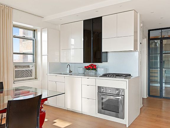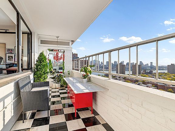 The most unique one bedroom in the entire coop! Grandfathered massive steel casement windows fully open onto a stunning 23 foot wide, 130 square foot terrace that overlooks the most beautiful vista of river, bridges and lower Manhattan. Brilliant light pours in to the large renovated living and dining rooms with wide plank floors and a sleek white lacquer kitchen with ample storage. Plenty of room to add a floating island and still retain a well-proportioned dining area. An ample office nook sits tucked just past the entrance foyer. The large one bedroom is currently used as a design studio with gorgeous floor to ceiling industrial-style glass and steel walls with French doors and a large closet. This room can easily be reconfigured into a king bedroom with walk in closet (see alt floorplan)! A windowed mosaic tiled bathroom completes this welcoming home.