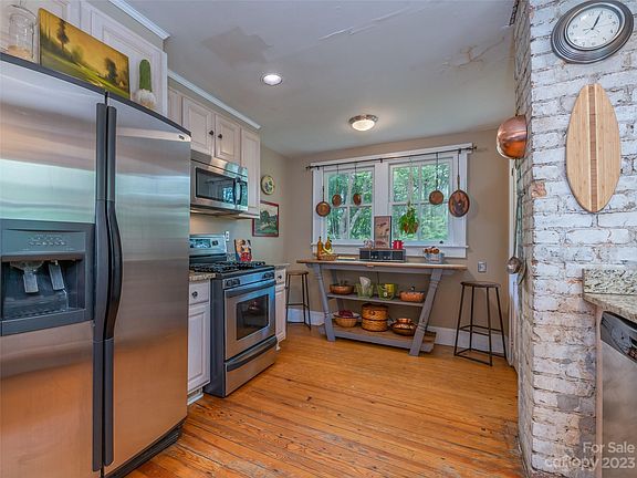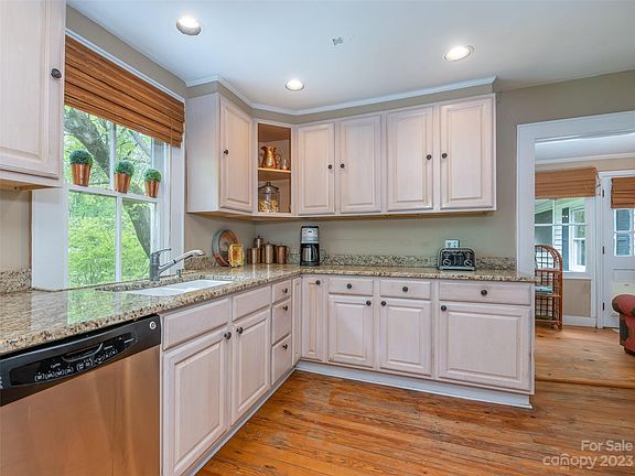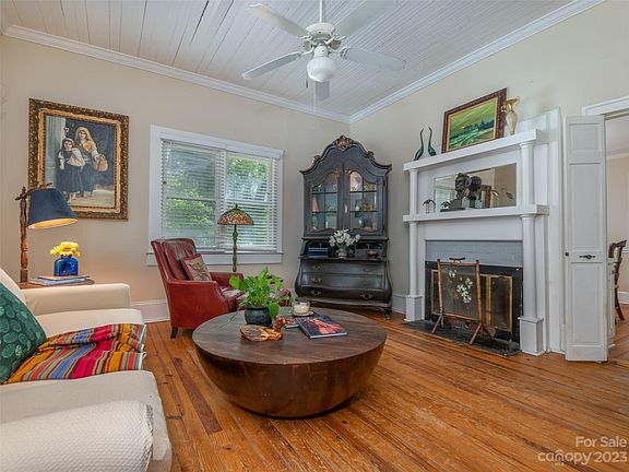 Constructed in the early 1900s, this two-story antique house is situated within a 1.4-acre (±) property conveniently located within walking distance of downtown Tryon. A covered verandah spans the front of the house and wraps around to a screened side porch. The house retains many of its original features, including the aged ambiance of wooden floors (except tile in the bathrooms), high ceilings with crown molding, chair rails, and original fireplace mantels. The kitchen is spacious and well-appointed, with stainless steel appliances. A formal dining room, kitchen, living room, and the primary suite are on the main level. There are two bedrooms upstairs. There's a detached building, plus an office bonus room and a bath below it. The wiring has been upgraded, and a new septic system has been installed. Additional land is available.