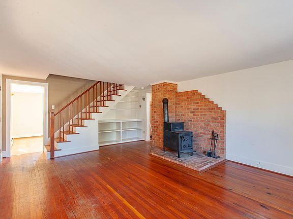 Heart pine, quartersawn oak, and tile floors throughout. Recent paint, lighting, and other upgrades. Living rooms on both floors. Upper open-plan LR can be used as office, family, or guest space. Lower LR has beautiful built-in bookcases, working woodstove (usage subject to approval), and picture window.