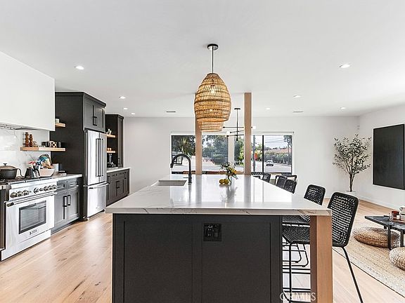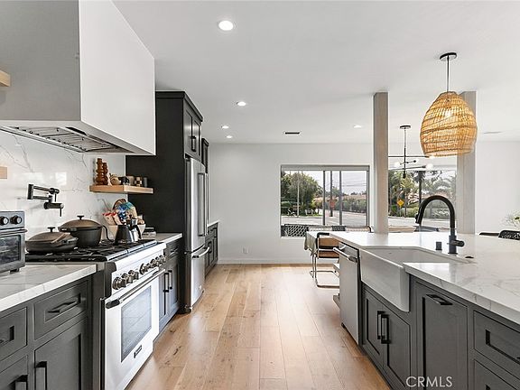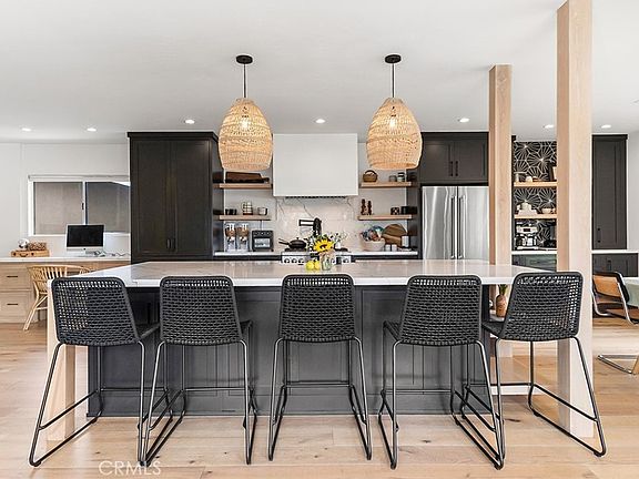 Experience this stunning three-bedroom, two-and-a-half-bath split-level mid-century modern home nestled on a corner lot in Alamitos Heights. The Meticulously renovated kitchen and living areas in this residence offer a perfect blend of timeless design and modern comforts. The chef’s kitchen is the true centerpiece, featuring quartz countertops, stainless steel appliances (including a six-burner Thermador range with pot filler), custom cabinetry that provide both style and functionality, a dedicated office nook, a sizable center island with a breakfast bar—ideal for entertaining, and a coffee or wine bar area dedicated to help you serve up your favorite beverages. The kitchen is open to the dining area, making dinner party hosting a breeze, and the living room so you can stay connected to family or guests! Additional features include elegant custom wood flooring throughout the main living, dining, and kitchen area, a large downstairs additional living space with sleek concrete floors, and a cozy rock fireplace, perfect for relaxation and chilly coastal evenings. Convenience is prioritized with a separated laundry facility complete with a sink basin and direct access to a two-car garage. Outdoor living is equally impressive with two backyard spaces featuring a seating area and artificial turf, perfect for outdoor gatherings. The covered front porch, adorned with concrete planters, offers a charming and retro welcome. A large primary suite upstairs provides a private retreat w/2 wardrobe closets and a private bath, & adjacent are 2 spacious guest bedrooms and additional guest bath. Extra benefits include newer central heat and air conditioning, a renovated downstairs powder room w/custom vanity, and new fixtures, recessed lighting throughout, new water heater, and numerous upgrades enhancing the home’s appeal. This exceptional home combines modern updates with classic mid-century appeal, offering a superb lifestyle in Alamitos Heights just a short distance to Colorado Lagoon, Marine Stadium, numerous shopping and dining options in Belmont Shore, and excellent schools! This home is perfect for anything from a primary residence, second home for private use, or to secure a phenomenal investment property in time for the 2028 Olympics right down the way from where training and events will be held!