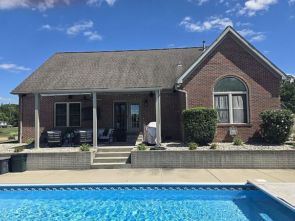 West- Brick 4 Bdrm, 3 Bath. Located only minutes from USI in St. Phillips. This home rests on over 1 acre of land. It has an 18x36 in ground pool with automatic cover with key lock for safety. A pool house with electric and a covered patio for entertaning. Amenities include vaulted and trayed ceilings, custom made Amish cherry cabinetry in kitchen with an island and stainless appliances. Arched windows, Gas fireplace in living room surrounded by more of the custom cherry built ins and cherry mantle. The main floor includes a master suite with master bath that has double sinks, walk in shower and oversized jetted tub. Also on the main level is a 2nd bdrm, full bath, dining rm, kitchen, office, living rm and laundry rm.. The 2nd level includes a 3rd bdrm with full bath and large walk in closet and 4th bdrm or bonus room with a walk in closet. 2.5 attached garage with extra driveway space for additional parking. Tankless hot water heater. Zoned HVAC. Also included: garage refrigerator with ice maker Sony surround sound system with bluetooth speakers inside and out for relaxing in the pool or on the patio, and additional flat screen TV mounted in the breakfast nook. Located in quiet St. Charles Place. Home comes with a 1 yr home warranty.