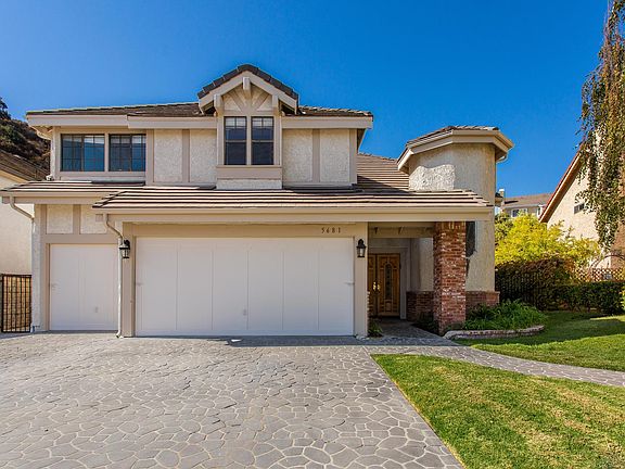 Incredible 5 bed 3 bath home situated in one of the best locations "Chateu Creek". Double doors entry to a large open floor plan, high vaulted ceilings & a beautiful dark stained sweeping staircase. Gourmet kitchen features white tile , dual sinks and dishwasher. 1 bedroom and bathroom on conveniently located on first floor for guests. 3 car garage. Family room/den with custom stacked stone fireplace and views of back yard. Spacious formal office or a 5th bedroom. The second floor boasts a balcony and beautiful built in wooden library. Separate air conditioner units for both up & downstairs. Spacious master suite with sitting room, and dual sink bathroom. Extremely private and quiet neighborhood in the Las Virgenes School district.