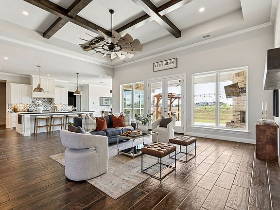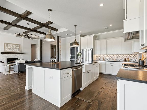 The open-concept layout is flooded with natural light and centered around a chef’s dream kitchen featuring an oversized island with breakfast bar and farmhouse sink, a stylish tiled backsplash, stainless steel appliances including a 6-burner gas range with griddle and pot filler, and abundant prep and storage space. The kitchen flows seamlessly into a spacious breakfast area and an inviting living room with a coffered ceiling and floor-to-ceiling stone fireplace.